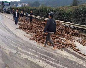 视频中的画面让人瞠目结舌,只见木料像雨点般从车上倾泻而下,瞬间将路面铺满。那场面,简直就像是一场木料盛宴!